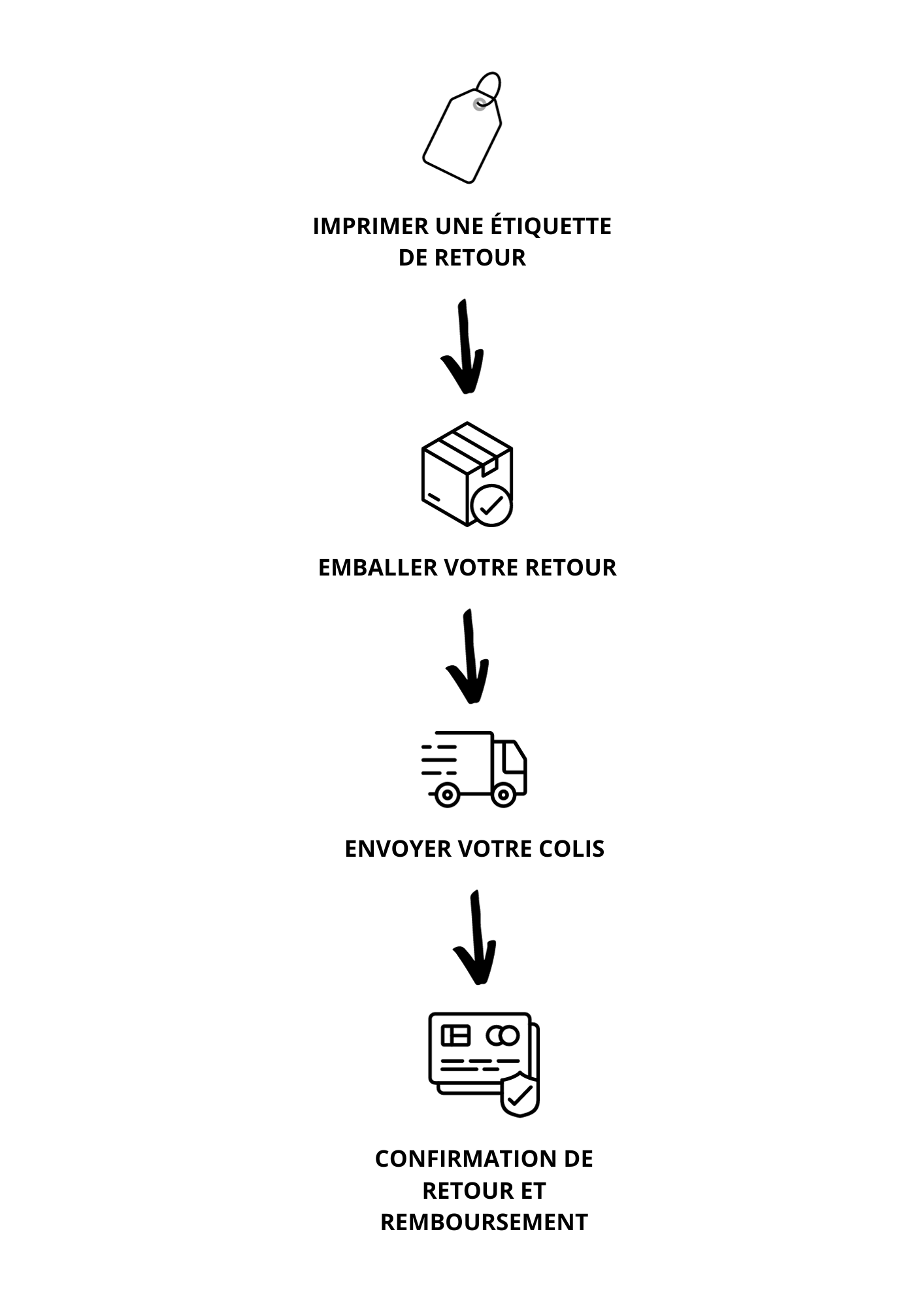 Les produits doivent être retournés tels que vous les avez reçus, dans leur emballage d'origine, avec toutes les étiquettes d'origine.